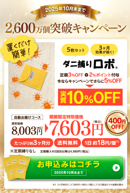 だから、高い効果と安全性を求めるなら「ダニ捕りロボ」を、まず一度試してみたいという方は、「ダニ捕りくん」を選んではいかがでしょうか?