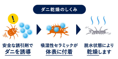 シート内に入った瞬間、吸湿セラミックがダニに付着し、100%ミイラ化退治。だから脱走なし、 シート内繁殖なし、 アレル物質も拡散なし。