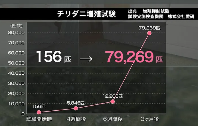 殺ダニできないシートを使うと、誘引剤がエサとなり、4週間で92倍、3か月で400倍にシート内繁殖したという実験結果も。これが脱走すると大変なことに。