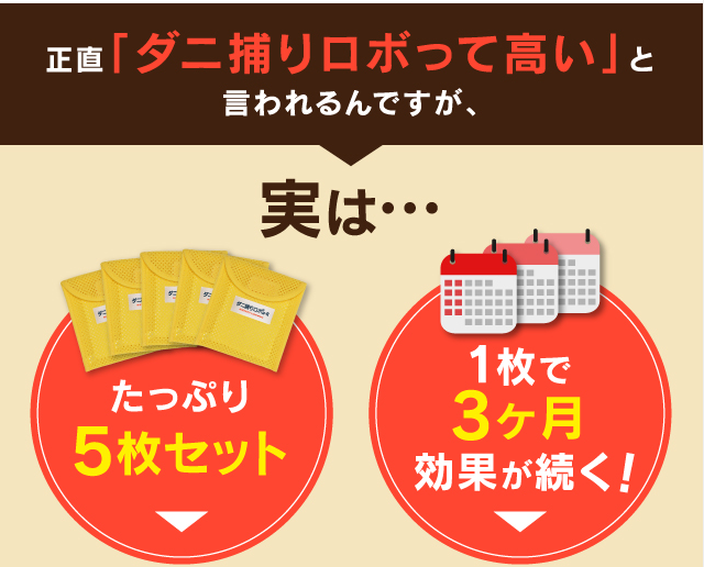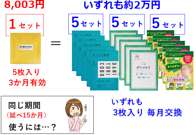 ダニ捕りロボ1セットと同じ期間(のべ15か月)使うためには、他社製品では5セットも購入が必要だったのです。