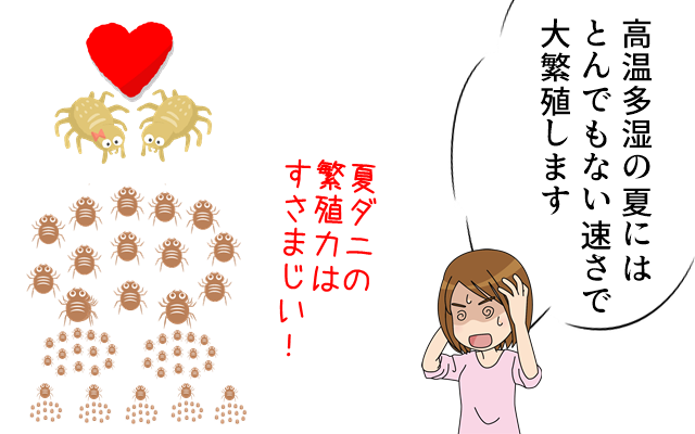 ということは計算上は、対策が1日遅れる毎に、2週間後からは毎日千~万単位で親ダニが発生することになります。この繁殖サイクルは秋まで続きます。