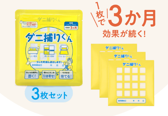 ダニ捕りくんは、シート内に誘引したダニを100%捕獲、100%退治。ダニ捕りロボと同等のスペックを維持しながら、初回購入ハードルが低いのが特徴です。
