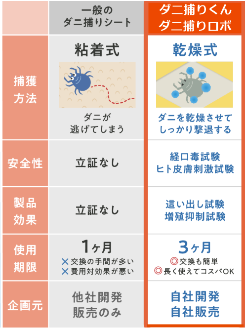 だから、高い効果と安全性を求めるなら「ダニ捕りロボ」を、まず一度試してみたいという方は、「ダニ捕りくん」を選んではいかがでしょうか?