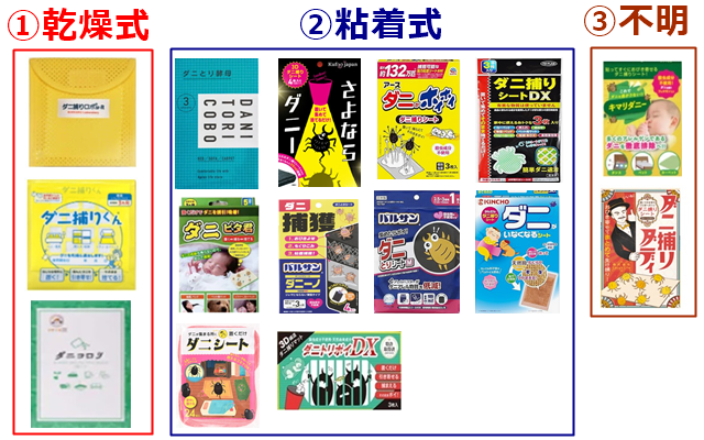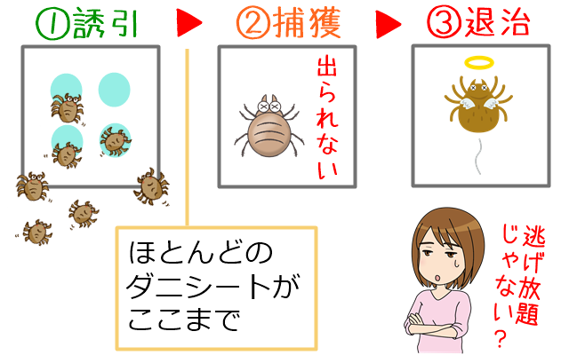 ダニ取りシートには①誘引→②捕獲→③退治の3工程がありますが、「粘着式」シートのほとんどは、効果が立証されていません。